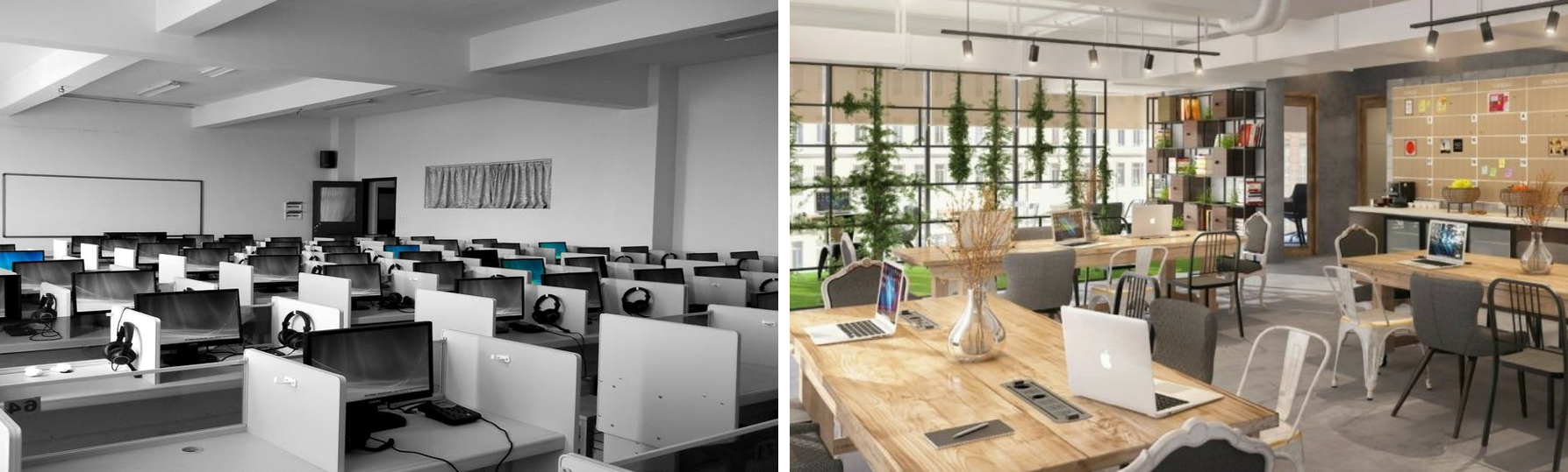 Now imagine if you witnessed both of these very different workspaces within a single corporate office, each space divided only by a thin wall and maybe a set of double doors. Wouldn’t that make you wonder about the dynamics of that corporate work environment? What set of parameters would define whether a person is placed in one workspace versus the other? Could it have to do with corporate hierarchy? Job function or description? There may even be questions around whether people from these two different office spaces even interact – and if they do, what it must feel like for them to cross over and enter into such a different work environment.